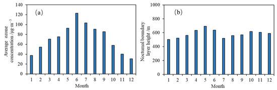 Monthly distribution characteristics of (a) average ozone concentration and (b) nocturnal boundary layer height in Dongying from 2022 to 2023.