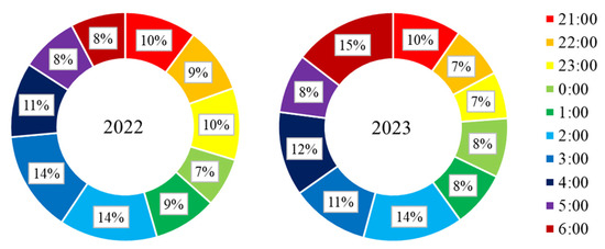 Compared with 2022, the frequency of NOE events at 22:00, 23:00, 1:00, and 3:00 in 2023 decreased, while the frequency at 0:00, 4:00, and 6:00 increased (Figure 10). Overall, the frequency of NOE events was the highest at 2:00 in Dongying, with a total of 66 events during the two years, followed by 3:00, 4:00, and 6:00. The distribution characteristics of NOE events in Dongying at different times in 2022 and 2023 were generally similar. The frequency of NOE events was higher between 2:00 and 4:00, while it was lower between 21:00 and 1:00 the next day. The NOE events exhibited a higher frequency around midnight and a lower frequency in the early night hours. This pattern may be attributed to the stronger NOx titration effects shortly after sunset, making NOE events less likely to occur during the early night hours [14,24,46].