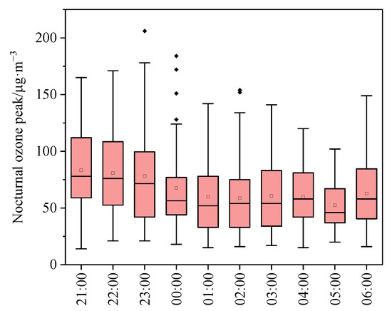 Nocturnal ozone enhancement events (NOE events): Based on the definitions of NOE events in previous studies [14,24,31], NOE events are defined as the ozone concentration increases by more than 10 μg/m3 in two successive hours of a given night (20:00 to 06:00 of the next day), and the corresponding nocturnal maximum O3 concentration is called the nocturnal ozone peak.