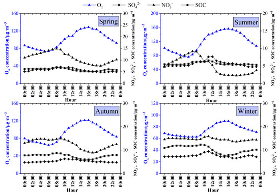 The daily variations in Ox concentrations also showed a single-peak distribution, with peak values of 129 μg/m3 (at 16:00), 156 μg/m3 (at 16:00), 121 μg/m3 (at 16:00), and 90 μg/m3 (at 16:00) during the different seasons. The PM2.5-bounded NO3− concentrations in the spring, summer, and autumn exhibited distinct daily variations, with higher concentrations in the early morning and night and lower concentrations in the afternoon, reaching peak values of 15 μg/m3 (at 8:00), 9 μg/m3 (at 7:00), and 15 μg/m3 (at 9:00). In winter, the NO3− concentrations showed a relatively gradual daily variation, with a peak value of 16 μg/m3 (at 11:00). The PM2.5-bounded SO42− concentrations exhibited a relatively gentle daily variation, with maximum values of 7 μg/m3 (at 9:00), 8 μg/m3 (at 12:00), 6 μg/m3 (at 12:00), and 9 μg/m3 (at 11:00) during the different seasons. The SOC concentrations showed a relatively gentle daily variation, with maximum values of 7 μg/m3 (at 7:00), 7 μg/m3 (at 11:00), 8 μg/m3 (at 11:00), and 12 μg/m3 (at 9:00).