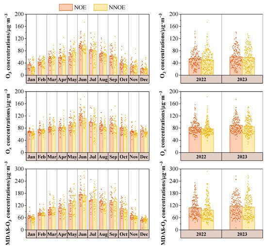 In 2022 and 2023, the average Ox concentrations on the next day of NOE events were 8 μg/m3 and 9 μg/m3 higher than those during the NNOE events in Dongying, respectively (Figure 16). The average Ox concentrations on the next day of NOE events were higher than those during NNOE events in every month except for February and May. The differences were higher in June, July, and August, with differences of 14 μg/m3, 15 μg/m3, and 10 μg/m3, respectively.