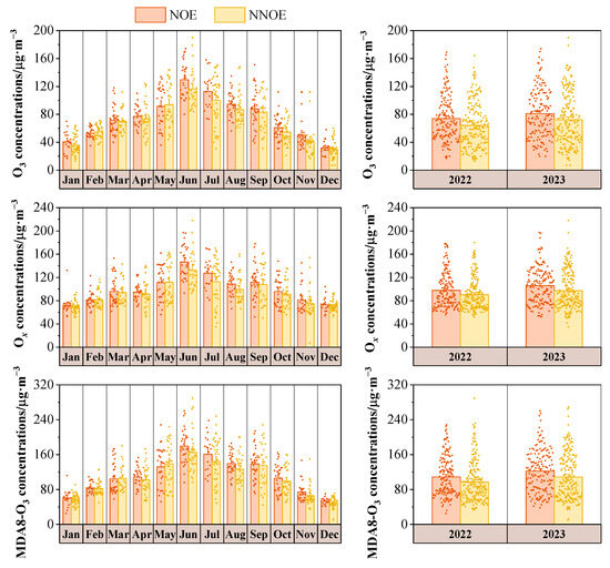 In 2022 and 2023, the average MDA8-O3 concentrations on days with NOE events in Dongying were 11 μg/m3 and 6 μg/m3 higher than those during NNOE events, respectively (Figure 15). The average MDA8-O3 concentrations on days with NOE events in January, April, June, August, October, and November were higher than those observed during NNOE events. The variations were observable in January (11 μg/m3) and August (17 μg/m3).