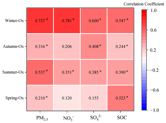 Correlations between Ox concentrations, PM2.5, and PM2.5-bounded components during different seasons of NOE events in Dongying from 2022 to 2023 (* indicates p < 0.05).