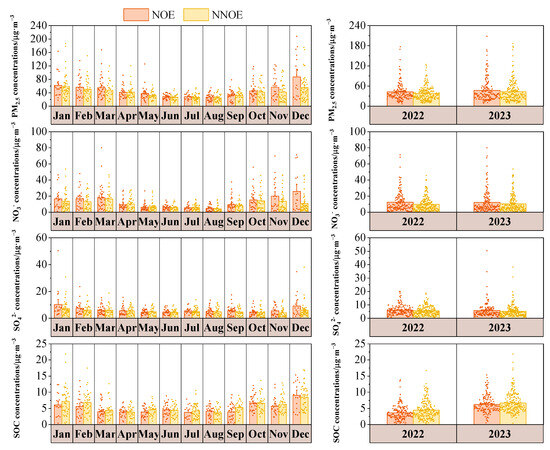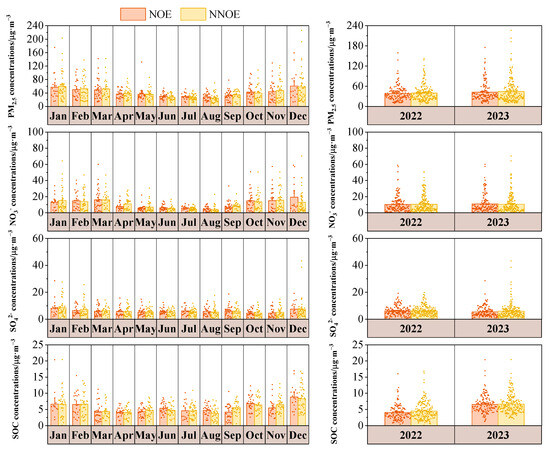 From 2022 to 2023, the correlations between the nocturnal Ox, PM2.5, PM2.5-bounded NO3−, SO42−, and SOC during the different seasons in Dongying were analyzed (Figure 17). Significant correlations were observed between the nocturnal Ox and PM2.5 as well as the SOC during different seasons in Dongying, with correlation coefficients ranging from 0.210 to 0.737. The correlation between the nocturnal Ox and PM2.5-bounded NO3− was significant in both the summer and winter, with correlation coefficients of 0.351 and 0.781, respectively. Additionally, the correlation between nocturnal Ox and PM2.5-bounded SO42− was significant in the summer, autumn, and winter, with correlation coefficients of 0.385, 0.408, and 0.600, respectively. Thus, it can be observed that the increase in the nocturnal atmospheric oxidation capacity in Dongying had a certain impact on the PM2.5 concentration and its secondary components. Based on the analysis in Section 3.3.2, the NOE events were found to increase the concentration of Ox, thereby enhancing the oxidation capacity of the atmosphere. Consequently, NOE events may have a certain impact on PM2.5 concentrations and their secondary components. Hence, the effects of the NOE events on the concentrations of PM2.5, PM2.5-bounded NO3−, PM2.5-bounded SO42−, and SOC in Dongying from 2022 to 2023 were further analyzed in this study.
