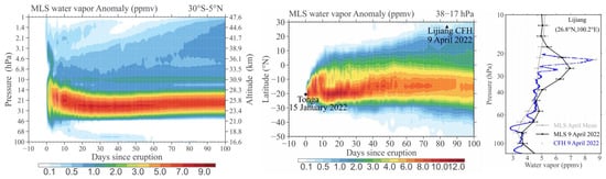 Conventional radiosondes cannot meet the precision requirements for measuring low stratospheric water vapor compared to abundant tropospheric water vapor. However, the Cryogenic Frostpoint Hygrometer (CFH) is an effective scientific instrument for detecting water vapor in the stratosphere. However, its high cost prevents it from being launched in the global operational upper air network. Twelve weeks after the eruption of the HTHH volcano, on 9 April 2022, the Institute of Atmospheric Physics of the Chinese Academy of Sciences launched radiosonde balloons from Lijiang, Yunnan (26.8° N, 100.2° E). The CFH measurements showed an enhanced water vapor signal at altitudes of 24–25 km in the extratropical westerly jet of the Northern Hemisphere (Figure 1: right). The measured water vapor value was 8 ppmv, and water vapor profiles from the Microwave Limb Sounder (MLS) also indicated an increase in water vapor at 20–30 hPa, with values of 6–7 ppmv [18,19].