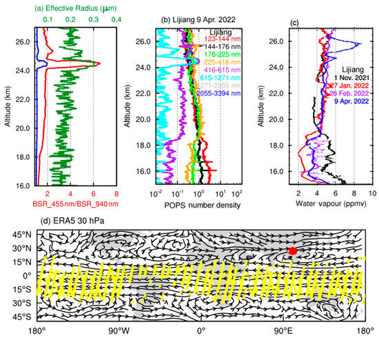 (a) Vertical profiles of the backscatter ratio (blue for 455 nm, red for 940 nm) data derived from the COBALD sonde and the effective radius (green) from the POPS measurements obtained in Lijiang on 9 April 2022. (b) Vertical profiles of the aerosol number density for bins of eight sizes from the POPS measurements obtained on 9 April 2022. (c) Profiles of water vapor on different days in Lijiang. (d) The European Centre for Medium-range Weather Forecasts (ECMWF) Reanalysis version 5 (ERA5) streamline data obtained at 30 hPa on 9 April 2022. The yellow dots mark the CALIPSO footprints when volcanic plumes (with altitudes of 22–25 km) were detected by an expedited level 2 vertical feature mask (VFM) algorithm on 7, 8, and 9 April. The asterisk marks the Lijiang site (from Figure 2 of Bian et al. [18]).