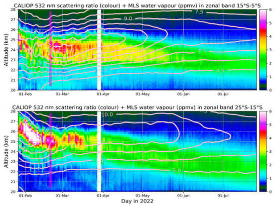 Panels (top, bottom) show zonal and latitude band averages as a function of time for the CALIOP 532 nm scattering ratio (color) and MLS water vapor (contours, ppmv) for the 15–5° S and 25–15° S latitude bands, respectively (adapted from Legras et al. [23]).