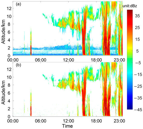 The time-height cross section of MMCR-observed radar reflectivity before (a) and after (b) quality control at GZWO on 20 May 2020.