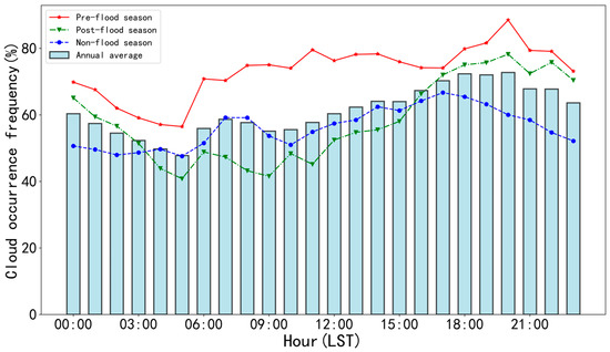 There are discernible differences in diurnal variation among different seasons. During the post-flood and non-flood seasons, there is a temporary decrease in the cloud occurrence frequency in the morning, followed by a subsequent increase in the afternoon. In contrast, during the pre-flood season, the cloud occurrence frequency remains relatively high throughout the morning, likely influenced by monsoonal moisture transport. Moreover, both the pre-flood and post-flood seasons exhibit significant increases in cloud occurrence frequency around 0016–0017 LST, reaching peak values of 70–80% around 0020 LST. In contrast, during the non-flood season, the cloud occurrence frequency peaks around 0017 LST at approximately 65% before rapidly declining and maintaining a relatively stable level during the night. Additionally, there are differences in the amplitude of diurnal variation in cloud occurrence frequency among different seasons, with the post-flood season exhibiting the highest amplitude and the non-flood season showing the lowest, which is primarily attributed to variations in solar radiation intensity across different seasons.
