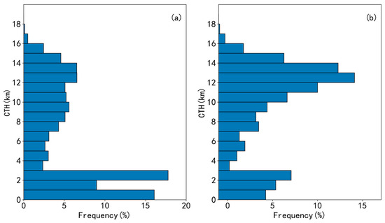 Cloud top height (CTH) reflects the vertical motion of the atmosphere. Studying CTH helps us to understand the vertical motion and thermodynamic structure of the atmosphere. By monitoring and analyzing changes in CTH, we can more accurately predict the occurrence and development trends of weather phenomena such as precipitation and severe convection. To investigate the variation patterns of cloud top heights, we computed the distribution of cloud top heights across different seasons. In cases of multiple cloud layers, the altitude of the highest layer’s cloud top is selected as the definitive cloud top height. Figure 5 shows the frequency distribution of CTHs at the GZWO during different seasons. As is evident from the figure, both the pre-flood and post-flood seasons exhibit a bimodal distribution of cloud top heights, with two peaks below 3 km and between 12 and 14 km. During the pre-flood season, the frequency of CTH below 3 km reaches around 43%. This is primarily attributed to the influence of the East Asian monsoon during this period. The abundant moisture transported by the monsoon leads to increased humidity, resulting in lower lifting condensation levels in the atmosphere. Consequently, cloud heights are relatively lower during this period, which aligns well with previous observations [37,43]. The frequency of CTH above 7 km increases with increasing altitude, reaching a secondary peak between 12 and 14 km. This is primarily attributed to the influence of frequent, intense convection events during this period in South China. Previous studies have indicated that, during intense convective events, cloud heights significantly increase [40].