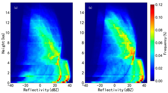 Normalized contoured frequency by altitude diagram (NCFAD) for precipitating clouds in (a) pre-flood season and (b) post-flood season.