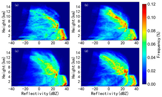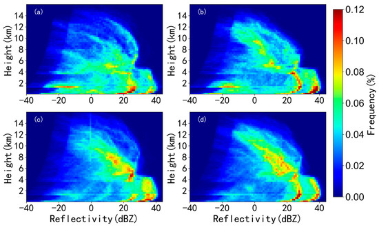 Normalized contoured frequency by altitude diagram (NCFAD) for precipitating clouds in pre-flood season during (a) 0000–0600 LST; (b) 0700–1200 LST; (c) 1300–1800 LST; (d) 1900–2400 LST.