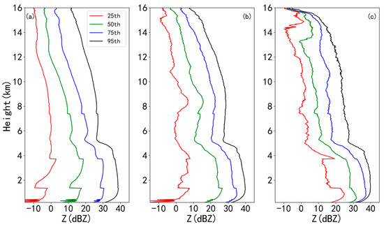 Profiles of cloud radar reflectivity under different precipitation intensities: (a) 0.1–9.9 mm h−1; (b) 10–19.9 mm h−1; (c) 20–30 mm h−1.