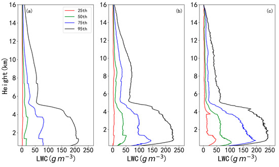 Profiles of cloud ice/liquid water content (IWC/LWC) under different precipitation intensities: (a) 0.1–9.9 mm h−1; (b) 10–19.9 mm h−1; (c) 20–30 mm h−1.