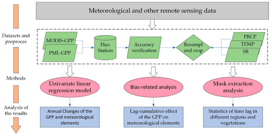 As a significant participant in the field of the global climate change, China, one of the world’s most populous countries, is committed to maintaining ecological balance and adapting to future climate changes. In 2021, China announced its dual-carbon goals during the United Nations General Assembly debate. We understand that vegetation plays a vital role in carbon storage and CO2 absorption. Furthermore, the process of the vegetation absorbing CO2 from the atmosphere is not instantaneous, as it takes time to grow and absorb, storing carbon within the plant’s structure. The Gross Primary Productivity (GPP) refers to the overall rate at which plants in an ecosystem convert solar energy into organic matter, typically in the form of carbon. The GPP reflects the total amount of captured and fixed light energy in the entire plant community [29,30]. A comprehensive study of the distribution characteristics of GPP in China and its response to climate change is of particular importance. This helps in evaluating China’s carbon balance and provides a scientific basis for formulating policies to mitigate climate change.