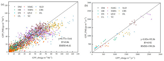 For the validation of the large-scale remote-sensing products, there is a lack of the more effective methods, and station data remain a crucial basis for the validating remote-sensing products [38,39]. While many GPP products have been validated in previous studies within various regions, there has been limited validation of GPP products specific to China [40,41]. Therefore, this article is based on the daily GPP observations from 11 flux sites in the ChinaFLUX observation network, further aggregated to an 8-day scale. To mitigate the impact of the data noise, geometric mismatch, and spatial heterogeneity on validation results, a 3 × 3 pixel mean filter mask was generated using the site center coordinates. This mask was used to extract values from PML-V2 and MODIS remote-sensing products at corresponding locations and compare them to the site’s values to demonstrate their reliability and acceptability for subsequent analysis. The accuracy evaluation metrics include the determination coefficient (R2) and the root mean squared error (RMSE).