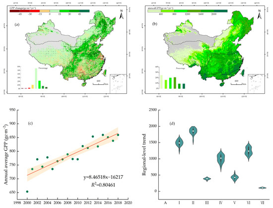 Figure 4a depicts the spatial pattern of the annual GPP changes. Regions with a significant increase in GPP (p > 0.05, Slope > 0) account for 31.47% of China’s total area, with 41.62% of those regions (concentrated in Regions IV and V) exhibiting highly significant increasing trends (p < 0.01, Slope > 1). However, the GPP decreased in 2.36% of land areas, primarily concentrated in Regions I and III. Over the period from 2000 to 2018, the rate of change in China’s annual vegetation production was 8.46 gc·m−2·yr−1 (Figure 4c), and the multi-year average shows a clear gradient of increasing values from the northwest inland to the southeast coastal areas (Figure 4b), indicating substantial carbon sequestration potential in China’s inland regions. Based on the explicit statistics of GPP changes in different regions (Figure 4d), the ranking of regional GPP change rates is as follows: II > I > VI > IV > V > III > VII.