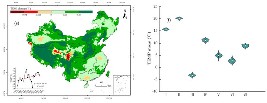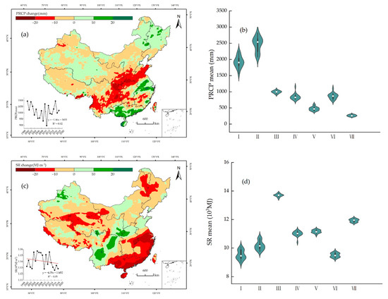 There were significant spatial heterogeneities in the distribution of the meteorological variables during the period from 2000 to 2018 (Figure 5). The temperature showed an overall increasing trend with a multi-year average rate of 0.03 °C, while precipitation and radiation decreased, with annual average decreasing rates of 1.46 mm and 4.35 MJ·m−2, respectively. Specifically, the temperature reached its peak in 2007 during the study period, with a national average of 7.33 °C, and then slightly declined, reaching its lowest point in 2012 (5.93 °C). The spatial distribution pattern is characterized by higher temperatures in the south and lower temperatures in the north. Region II consistently had the highest temperatures during the study period, with a multi-year average of 20.12 °C, followed by Region I (15.68 °C), while Region III had lower average temperatures (−3.24 °C). Special geographical locations and climate conditions may contribute to this variation, but Region III has shown a noticeable increase in temperatures in recent years, with an average annual increase of 0.04 °C. At the same time, Regions I, II, and III also exhibit some degree of decreasing trends. Precipitation, on the other hand, displays an overall fluctuating downward trend, reaching its lowest point in 2011 (897.69 mm). The spatial distribution pattern shows that the eastern and southeastern coastal areas receive more abundant rainfall, with a ranking of precipitation amount from highest to lowest in the seven regions as follows: II > I > III > VI > IV > V > VII. The ocean carries moist air into the inland regions, where it meets cold air, leading to rainfall. In contrast, the western regions are located further inland, making it challenging for maritime moisture to reach them. Additionally, these regions have extensive grasslands and deserts, contributing to drier conditions and serving as important factors causing regional differences in precipitation.