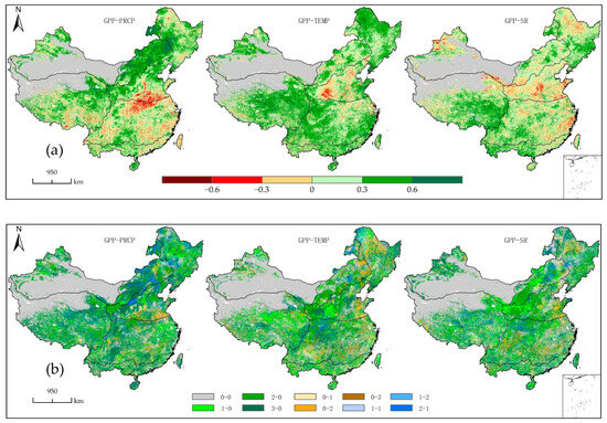 By analyzing the correlation coefficients between GPP and meteorological variables within different time periods, specifically the lag and cumulative effects in the 0–3 months prior to the vegetation growing season, this study aimed to explore the sensitivity of GPP changes to climate variables. For example, a lag of 1-0 (one-month lag, zero-month accumulation) for a given year implies that the total GPP for May to September is correlated with meteorological variables for April to August. A lag of 1-1 (one-month lag, one-month accumulation) means that the GPP for May to September is correlated with meteorological variables for March and April to July and August.