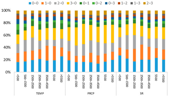 The response ratio of vegetation GPP to meteorological elements varies with different altitudes (Figure 8). Specifically, as altitude increases, the proportion of the GPP’s cumulative response without lag to temperature increases. Within the altitude range of 3500–5500 m, the proportion of the high-lag 1-0 stage is higher, accounting for 23.38%. The GPP’s response ratio to rainfall in stages 3-0 is higher, concentrated in the range of 500–2500 m and above 5500 m. The proportion of GPP’s cumulative response without lag to radiation is higher in regions with altitudes less than 500 m, and this proportion tends to decrease with increasing altitude. Additionally, the proportion of the GPP’s cumulative response to radiation increases with increasing altitude.