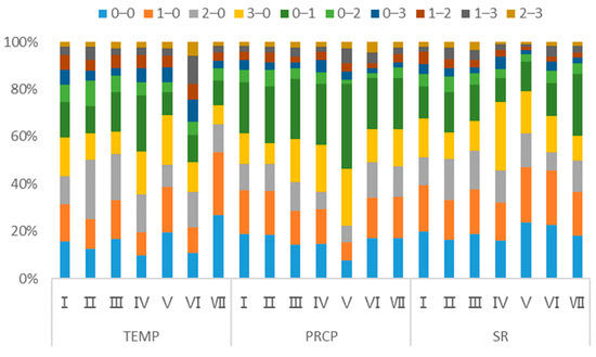 From a climatic-zone perspective, there are significant differences in the response to meteorological elements in various regions (Figure 9). Specifically, when examining the lag-accumulation effects of the GPP in response to temperature, the stages with the highest proportion, from Region I to Region VII, are as follows: 3-0 (17.87%), 2-0 (27.37%), 2-0 (22.46%), 0-1 (25.39%), 3-0 (24.45%), 2-0 (15.74%), and 1-0 (35.01%). For GPP responses to rainfall, the stages with the highest proportion of lag are all 3-0, with proportions ranging from 24.42% in Region VII to 32.10% in Region IV. Regarding GPP responses to radiation, the stages with the highest proportion of lag-accumulation effects in these seven regions are as follows: 1-0 (23.24%), 2-0 (19.83%), 1-0 (21.92%), 3-0 (33.56%), 1-0 (28.42%), 2-0 (27.71%), and 0-1 (30.86%).