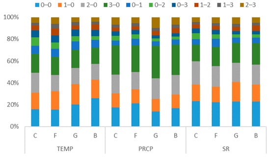 Apart from regional differences, different land-use types exhibit varying responses to meteorological elements. Therefore, we calculated the proportions of lag stages of the GPP response to meteorological elements in several land-use types with higher representation (Figure 10). For instance, cropland and forest GPP have the highest proportions for the temperature lag stages of 2-0 (18.05%) and 1-0 (17.10%), respectively. Grassland and barren-land GPP have the highest proportions of areas that do not exhibit a lag response to temperature, at 20.09% and 25.88%, respectively, mainly concentrated in Regions V and VII. Furthermore, all four land-use types have a relatively consistent pattern in their GPP response to rainfall (3-0) and radiation (0-0), with proportions exceeding 20%. This pattern may be related to the soil’s water storage capacity. After rainfall, the water stored in the soil takes time to be absorbed by plants and released into the atmosphere through transpiration. Unlike rainfall, solar radiation reaching the Earth is almost instantaneous and typically does not require time for accumulation or release.
