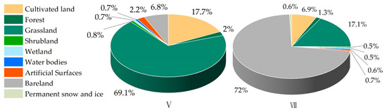 This paper elucidates the lagged responses of the GPP to meteorological elements in different regions and vegetation types across China. It also reveals that regions in China, especially Regions V and VII, exhibit the highest proportion of the GPP with no lag effects in response to temperature and radiation. We propose that this observation may be attributed to the high prevalence of the single vegetation types and a significant proportion of barren land and grassland in these regions (Figure 11). The Grasslands and barren lands typically consist of the less vegetation or exposed soil, which have relatively lower heat capacity and higher surface reflectance [65]. The high surface reflectance allows them to more effectively reflect heat, reducing their heat absorption and temperature increase capabilities. Additionally, the low heat capacity means that they can quickly warm up or cool down when exposed to heat radiation, without requiring an extended period to accumulate or release heat. Consequently, these areas do not exhibit significant lag effects.