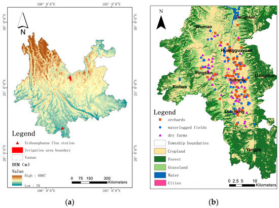 Overview of the study area. (a) Location of the Yuanmou Irrigation District in Yunnan Province, China. (b) Distribution of measured points in Yuanmou Irrigation District.