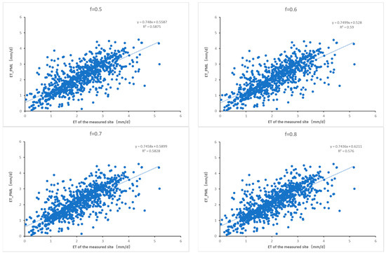 This study first evaluated the accuracy of ET inversion using the 2013–2015 tropical seasonal rainforest carbon flux observation dataset of Xishuangbanna. Simultaneously, the sensitivity of the soil evaporation coefficient, as an important parameter in the model, on the accuracy of ET inversion was assessed. Here, we tested the sensitivity of the soil evaporation coefficient within the range of 0.5–0.8, with a step size of 0.1. The results are shown in Figure 2. The results indicate that within this range, the soil evaporation coefficient has a minor influence on the accuracy of ET inversion, with R2 values consistently above 0.57. Among the tested values, the highest R2 value of 0.59 was achieved when the soil evaporation coefficient was set to 0.6. Therefore, in this study, the soil evaporation coefficient was set as 0.6 for model calculations.
