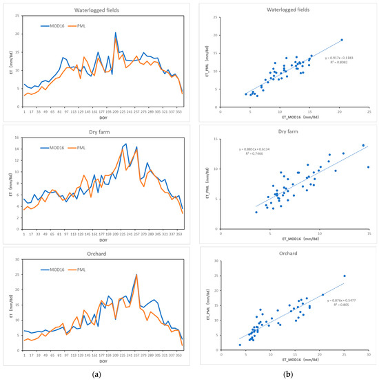 Due to the lack of ET data observation equipment in the study area, a cross-validation method was used to further indirectly assess the accuracy of ET inversion, and the ET product used was MODIS ET product MOD16. In order to comprehensively compare the accuracy of ET inversion results in terms of temporal and spatial scales, this study selected typical representative points on different types of farmland (waterlogged fields, dry farms, orchards) and evaluated the comparison between the ET inversion results and MOD16 for the whole year at each representative point, as shown in Figure 3. Through the analysis, it was found that the fitting results of the ET inversion results and MOD16 were good, with R2 values of the three different types of farmland all above 0.7, indicating a high correlation. Among them, the fitting accuracy of the PML model’s ET inversion results for paddy fields and orchards was better than that for dry fields, with R2 values above 0.8. In terms of the annual process, the change trend of the PML model’s ET inversion results was more consistent with MOD16, and the correlation in summer was better than that in winter, with the ET inversion results of the PML model in winter lower than those of MOD16. In addition, comparing the ET values of the three different types of farmland, it was found that the annual ET total of paddy fields and orchards was higher than that of dry fields, indicating that the total annual ET was affected by irrigation.