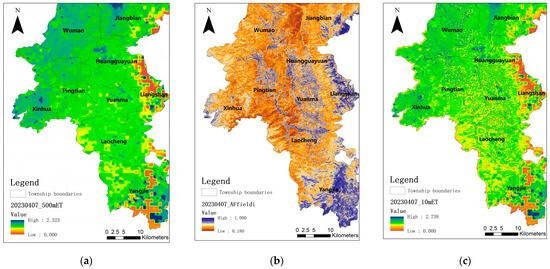 (a) The inversion results of ET at a spatial resolution of 500 m. (b) The ET allocation factors. (c) The downscaled ET outcomes at a finer spatial resolution of 10 m.