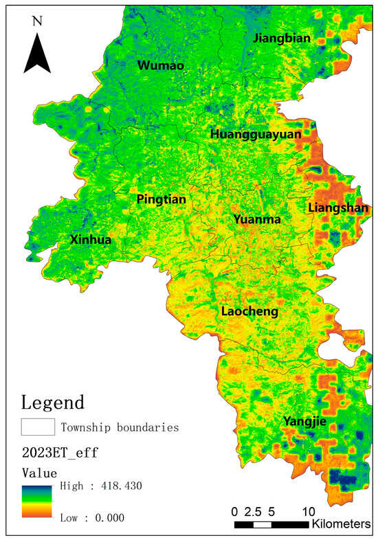 3.2.2. Spatial Distribution Characteristics of Cumulative Effective ET in 2023