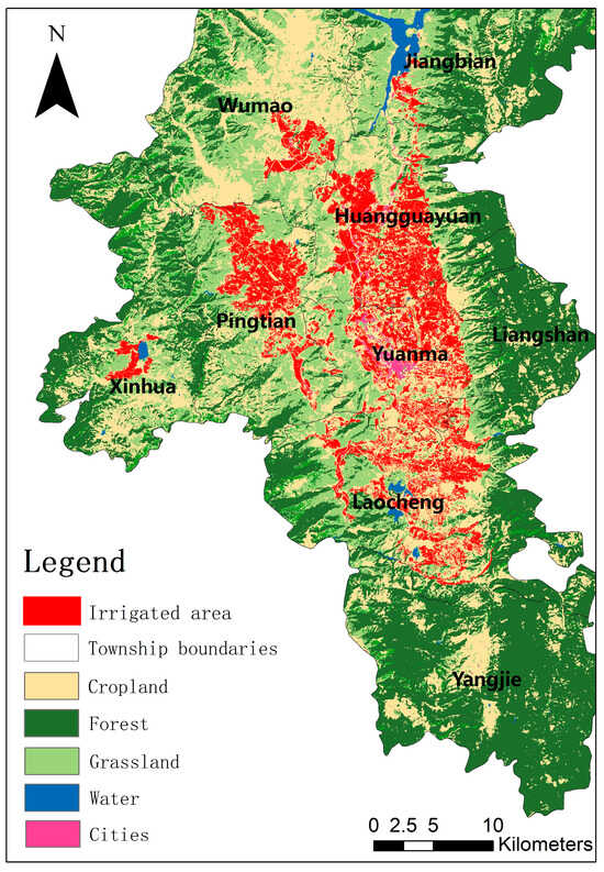 This study focused on the Yuanmou Irrigation District as the research area (Figure 1). Located in Yuanmou County, Yunnan Province, the Yuanmou Irrigation District lies within the Jinsha River dry and hot valley region in the central Yunnan Plateau, characterized by a tropical climate. Regional soil types are predominantly loamy. The average annual rainfall is 642 mm, the average elevation is 1100 m, and the annual average temperature in the county is 21.9 °C, with extreme maximum temperatures reaching 43 °C. Benefiting from abundant solar radiation, suitable elevation, a hot climate, and the absence of a winter season throughout the year, it is often referred to as a “natural greenhouse.” This region is suitable for the growth of various plants and serves as a production base for developing tropical cash crops, early winter vegetables, and flowers.