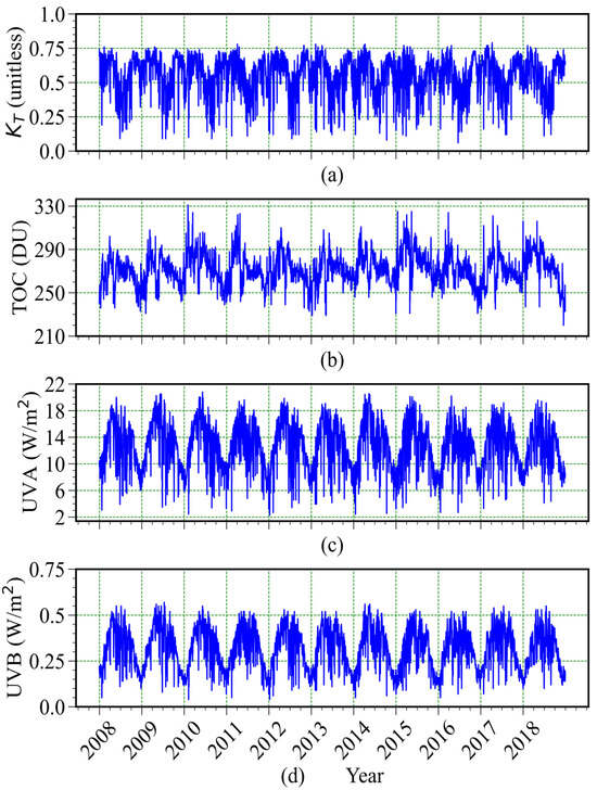 The offset and amplitude of the seasonal component of UVA are 12.6 W/m2 and 3.0 W/m2, respectively. The offset and amplitude of the seasonal component of UVB are 0.32 W/m2 and 0.11 W/m2, respectively. The result shows that the seasonal variation in UVB is about 33%, in UVA is about 24%, and in clearness index is about 14%, whereas the seasonal variation in the TOC is only 4%. Previous studies have also indicated that the total amount of ozone in the atmosphere generally increases with latitude and is also affected by the season [32]. Also, the solar cycle plays a fundamental role in the variation in ozone concentrations [47].