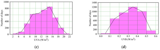 Figure 2c and Figure 3c display the daily variation and histogram of ultraviolet A (UVA), respectively. On 9 June 2010, UVA reached a maximum value of 20.79 W/m2, and it reached a minimum of 2.31 W/m2 on 9 January 2012. The average UVA value for the 11 years was 12.61 ± 3.50 W/m2. The key statistical measures, including the first, second, and third quartiles, were identified as 9.87 W/m2, 12.88 W/m2, and 15.27 W/m2, respectively. The distribution of UVA was negatively skewed, with a skewness of −0.17 and a kurtosis of −0.64. This indicates a negatively tailed distribution that deviates from Gaussian normality. Notably, during the study period, 846 days recorded UVA values between 14 W/m2 and 16 W/m2. These analyses provide insights into daily, monthly, and annual variations in clearness index, total ozone column, and UVA. Figure 2d and Figure 3d present the daily variation and corresponding histogram of ultraviolet B (UVB), respectively. The highest recorded UVB value was 0.57 W/m2 on 14 July 2009, while the lowest value of 0.04 W/m2 was recorded on 9 February 2010. Over the 11-year study period, the average UVB rate was calculated to be 0.32 ± 0.11 W/m2. Key statistical measures were identified with the first, second, and third quartiles at 0.22 W/m2, 0.33 W/m2, and 0.41 W/m2. The distribution of UVB had a skewness of −0.10 and kurtosis of −1.00. The distribution was negatively tailed and was not Gaussian. Notably, 1204 days during the study period featured UVB values falling within the range of 0.3 W/m2 to 0.4 W/m2.