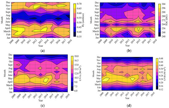 Similarly, Figure 4d illustrates the annual variation in UVB. The yearly average of the maximum UVB value is 0.33 ± 0.11 W/m2 in 2009, with the monthly average of the maximum at 0.42 ± 0.07 W/m2 in May. The annual average of the minimum UVB value is 0.30 ± 0.10 W/m2 in 2015, with the monthly average of the minimum at 0.16 ± 0.02 W/m2 in December. These comprehensive analyses provide valuable insights into atmospheric parameters’ annual and monthly dynamics.