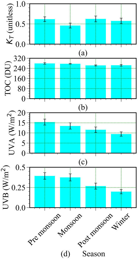 Figure 5 illustrates the seasonal changes in the KT, TOC, UVA, and UVB. The seasonal variation in KT is shown in Figure 5a. The maximum value of 0.62 ± 0.10 was recorded during the post-monsoon period (October and November), while the minimum value of 0.46 ± 0.12 was during the monsoon season (June, July, August, and September). This season, Nepal experiences the highest rainfall during the monsoon season, positively impacting the cleanliness of the atmosphere due to rain.