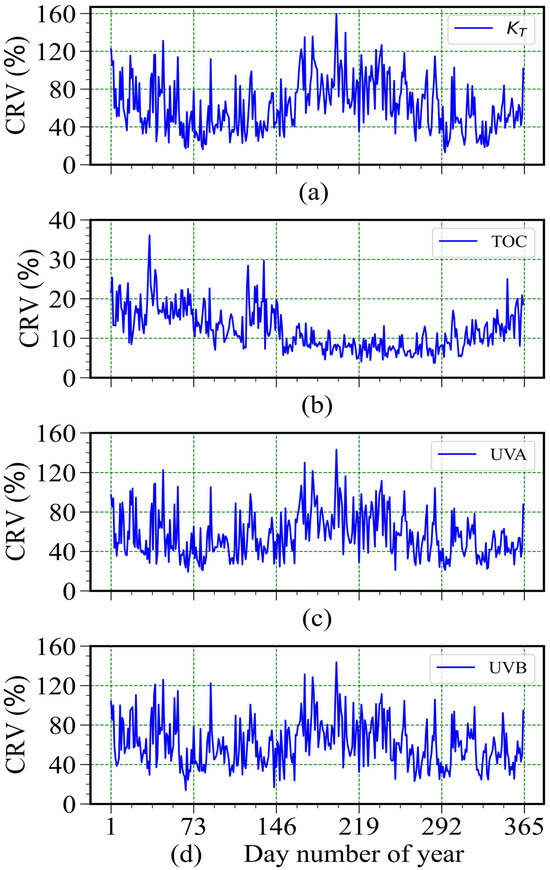 The minimum CRV value was recorded at 13% on the 296th day of the year, associated with a 4% CV. There was a small variation in the clearness index on that day. The maximum value of CRV of the TOC was found to be 36% on the 35th day of the year due to a 9% CV, and the minimum value was 4% on the 286th day of the year due to the 1% CV. The maximum value of CRV of UVA was found to be 143% on the 200th day of the year due to the 44% CV, and the minimum value was 19% on the 69th day of the year due to the 9% CV. The maximum value of CRV of UVB was 144% on the 200th day of the year due to the 46% CV, and the minimum value was 14% on the 67th day of the year due to the 4% CV.