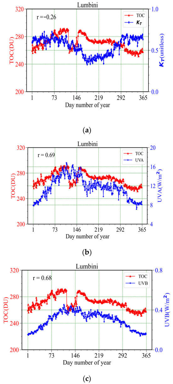Figure 8 shows the variation in the TOC with KT, UVA, and UVB. Here, the correlation coefficient (r) was used to find the relation between two variables. There was no significant effect of the clearness index on the TOC, but there was a positive effect of UVA and UVB on the TOC. Lumbini, a nearby place in the IGP region, experiences changes in seasonal aerosol levels. Studies have shown that aerosol levels are highest during the post-monsoon and pre-monsoon periods, followed by winter, while the lowest levels occur during the monsoon season [48]. However, cloud cover is highest during the monsoon (June to September) and lowest during the pre- and post-monsoon [49]. As shown in Figure 8a, the KT parameter with a minimum in summer and higher values during the pre- and post-monsoon indicate that it is strongly affected by clouds rather than by air quality.
