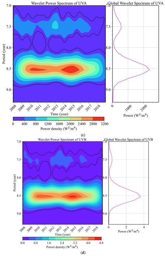 In Figure 9, the continuous wavelet transform (CWT) of the KT, TOC, UVA, and UVB is presented. Figure 9a shows the wavelet power spectrum (WPS) and Global wavelet power spectrum GWS of the KT. A power density of KT greater than 2.4 was recorded from mid-2009 to 2011 in an 8.5-year period. This is also shown in the global wavelet spectrum (GWS). From 2011 to 2018, the power density of KT is observed greater than 1.0 in that 8.5-year period and with closer to 2.0 from the end of 2016 to the end of 2017, respectively. Figure 9b shows the WPS and GWS of the TOC. The power density of the TOC recorded from the end of 2010 to the end of 2011 was about 35,000 DU2. This is also shown in the GWS. From mid-2017 to the start of 2018, the power density of the TOC was between 30,000 and 35,000 DU2 in the 8.5-year period. Figure 9c shows the WPS and GWS of UVA. The power density of UVA recorded from 2010 to 2012 and 2014 to the end of 2015 was greater than 2800 (W/m)2. This is also shown in the GWS. Figure 9d shows the WPS and GWS of UVB. A power density of UVB greater than 4.6 (W/m)2 was recorded from 2010 to mid-2012 and mid-2014 to mid-2015 over an 8.5-year period. This periodicity demonstrates the complex interplay the broader atmospheric processes.