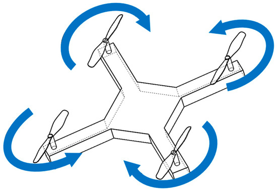 To maintain equilibrium and prevent the drone from spinning in the opposite direction from the rotors during flight, a quadcopter places four rotors equally distributed around the body of the drone, where two rotors spin clockwise, and two rotors spin counterclockwise, as shown in Figure 1 [36].