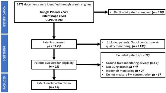As shown in Figure 3, the patent search yielded 1473 documents. In Table 4, the number of documents from each search engine is presented. It is identified in Table 4 that Google patents provided 579 documents, followed by WIPO’s PatentScope with 504, and finally USPTO with 390, of which 318 were duplicates. In the screening phase, 1155 patent documents were analyzed to determine whether drones for air pollution monitoring had been developed. Only 13 patents met this inclusion criterion presented in Table 3, which was to present the design of a drone for monitoring outdoor air pollution.