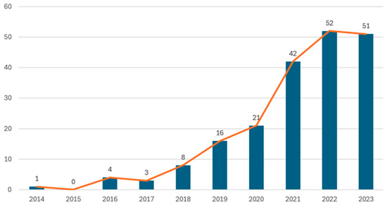 Since 2017, the number of articles has increased year by year until 2022. In 2023, the number of published articles did not increase; instead, the number of articles decreased by one with respect to 2022. The highest increase in a single year occurred in 2018 (166%), followed by the increase presented in 2021 (100%).