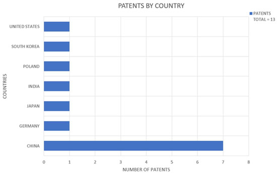Figure 5 shows the country of origin of the identified patents. Data show that China is in the leading position in the research and development of air pollution monitoring drones with a patent ratio of 53.84%. The remaining patents found in this work correspond one to each of the following countries: Unites States, South Korea, Poland, India, Japan, and Germany.