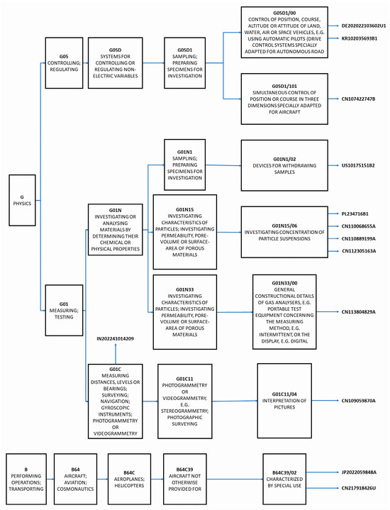 In terms of patents, it was found that 69.23% (9/13) are currently active and the rest are under review. According to the World Intellectual Property Organization (WIPO), each patent reviewed is classified according to its corresponding technical field. Figure 6 shows this classification and shows that two main classes were identified: G (Physics) and B (Performing operations; Transporting). Regarding class G, 53.84% (7/13) of patents belong to the G01 measurement and testing subclass. The subclass G01 typically encompasses patents related to measuring and testing technologies, including devices and methods for quantifying various parameters, such as physical dimensions, electrical characteristics, chemical composition, and environmental factors. These patents often involve innovations in instrumentation, sensor technologies, data analysis techniques, and quality control methodologies. Regarding class B, two belong to subclass B64C39/02. This subclass groups aircraft that are used for several general purposes with general payloads; therefore, several patents that use drones to carry air quality and/or meteorological parameter sensors fall in this subclass.