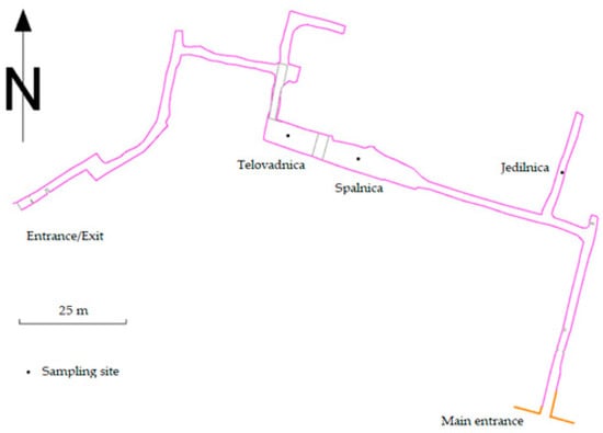 Sampling sites are in Sežana Hospital Cave. The floor plan is adapted from the register of the Karst Research Institute, the Research Center of the Slovenian Academy of Sciences and Arts.