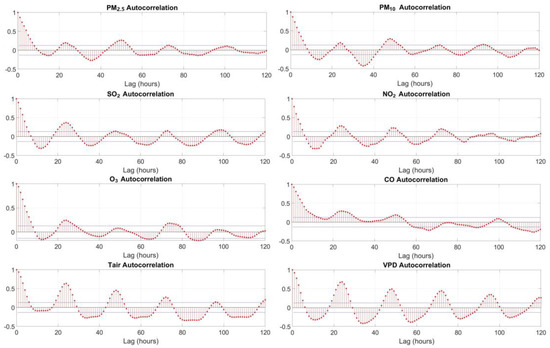 Auto-correlation, as the name suggests, is a mathematical representation of the degree of similarity between a given time series and its lagged version of itself in continuous time intervals. It is conceptually similar to the correlation between two different time series, but it uses the different versions of time slices of the same time series for both, i.e., one in the original form and the other in the version lagged by one or more units of time periods. In other words, it measures the relationship between the current value of a variable and its past values. An auto-correlation of “+1” indicates a perfect positive correlation, while “−1” indicates a perfect negative correlation. In real-world applications, e.g., auto-correlation can be used to measure how much the past price of a product affects its future price, etc. In Figure 1, for this research, the auto-correlation of each time series is used to visualize and explore its 24 h oscillation and seasonality. It can be seen that there are sine waves repeating at 24 h, 48 h positions, etc., in the small graphs of PM2.5, PM10, SO2, NO2, ozone, CO, air temperature, and water vapor pressure deficit (VPD), respectively, with the auto-correlation visualization. In particular situations, it is important to note that these obvious patterns may not exist throughout the whole time series because there may be some anomalies or outliers caused by severe weather, special atmospheric phenomena, or human activities that affect the diffusion or dispersion of the air pollutants.