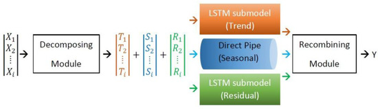 where t is the running time and k is the index of the sub-model for different wavelet components. In this case, there are only 3 components decomposed, i.e., trend (T), seasonal (S), and residual (R). Therefore, as in Equations (6) and (7):