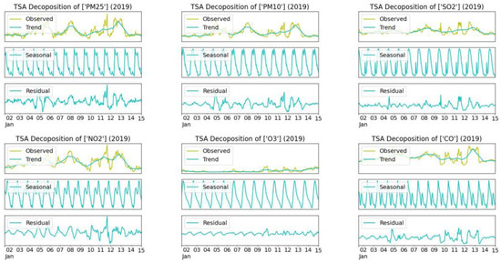 Modeling based on the decomposition of time series data and feature optimization can effectively improve the accuracy of medium- and long-range time series forecasts related to flux-behaved elements [19]. For the decomposing module, the original multivariate time series (MTS) dataset used to predict the concentration of the six air pollutants is decomposed by the additive method into 3 components: trend (T), seasonal (S), and residual (R), respectively, with the additive method of the Python TSA stats model package in Equation (4), as follows: