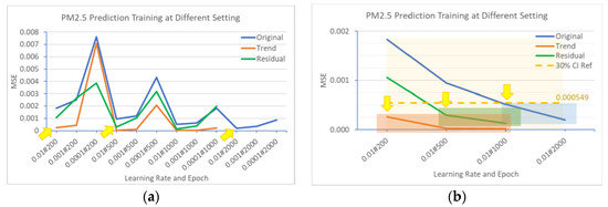 In order to analyze, synthesize, and compare scientifically, some mathematical analysis, as shown in the figures, can help to obtain a standardized and normalized environment, which is necessary for all the experiments to take place. To define the hyperparameter domain for tuning and standardizing the experiment environment, it includes defining the fixed learning rate from 0.01 to 0.0001 and selecting the number of epochs from 200 to 2000. Then, some tests were carried out under this domain, and we selected those with a small MSE. In Figure 4a, all the trend, residual, and original TS will be best trained with a learning rate of 0.01. Thus, for all the experiments that would take place, the learning rate would be fixed at 0.01. After standardizing the learning rate, it is time for the number of epochs in each iteration to be considered. In Figure 4b, the big yellow box shows the domain of the hyperparameter, and, with the fixed learning rate of 0.01, it is considered to be good when the mean squared error (MSE) reaches a certain level, and in this case, the MSE value of 0.000549 is calculated as the 30% C.I. reference base to the worst-case MSE result of 0.00183. With this minimum number of epochs, the result can be yielded below this yellow dotted line, so that they are defined and selected, i.e. the hyperparameters pointed by the yellow arrows in the Figure 4b. The values of hyperparameters can be selected inside the orange, green and blue shaded portions for Trend, Residual and Original components respectively. Eventually, the number of epochs equaling 200 is selected for the trend component, 500 is selected for the residual component, and 1000 and 2000 are selected for the original TS.